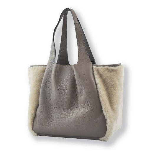 Torebka skórzana damska taupe RipaniTorebka damska wykonana ze skóry cielęcej groszkowej w połączeniu z futerkiem. W przedniej i tylnej części kieszonki szybkiego dostępu. Środek jedna komora zamykana na zamek.