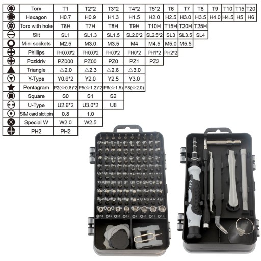 Zestaw 115 narzędzi serwisowych (bity, otwieraki, wkrętaki, pęseta, magnetyzer i inne).