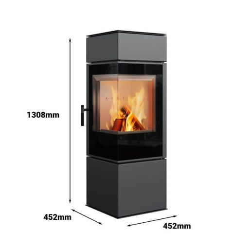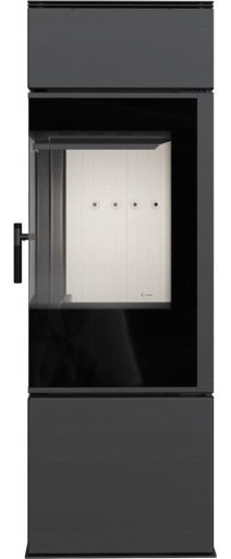 Przestronne przeszklenie uatrakcyjnia wizję ognia, a dodatkowa ozdobna szyba typu glass podkreśla jego urok. Wnętrze pieca wyłożone TERMOTEC doskonale kontrastuje z bryłą, nadając całości nowoczesnego wyglądu.