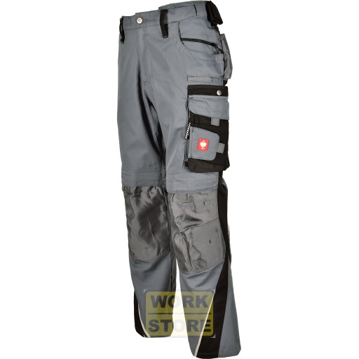 Nowoczesne spodnie robocze w bardzo stylowym kroju wykonane z trwałego materiału poliestrowo-bawełnianego z potrójnymi przeszyciami. Zastosowanie stretchowych paneli znacząco podwyższa komfort użytkowania i zmniejsza poziom zmęczenia w czasie pracy. Spodnie posiadają również podwyższony pas z tyłu elastyczne wykończenie na bokach kieszenie na nakolanniki oraz liczne obszerne kieszenie na narzędzia i rzeczy osobiste.