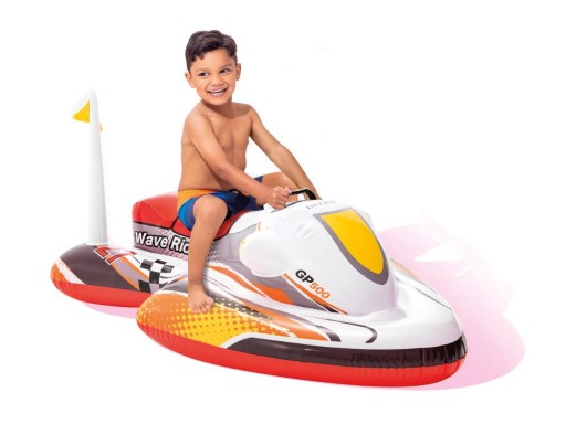 Specjalnie dla małych miłośników wodnych atrakcji, stabilny, dmuchany skuter wodny do pływania! Został wykonany z mocnego i wytrzymałego materiału winylowego (PVC). Wyposażony został w wytrzymały uchwyt stabilizujący, który zwiększa bezpieczeństwo użytkowania. Posiada szeroką podstawę dla dodatkowej stabilności. W zestawie znajduje się łatka naprawcza, dzięki której naprawisz ewentualne, drobne uszkodzenie.
