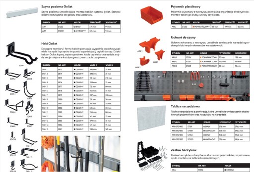 - Szyna WLS - umożliwia instalację wsporników jednorzędowych: WSS, WSK (różne rozmiary), oraz różnego rodzaju akcesoria: tablica perforowana PB (tablica umożliwia wpięcie drobnych akcesoriów), szyna goliat RR (do której wpinamy haki Goliat), wieszak na spodnie RWJ,