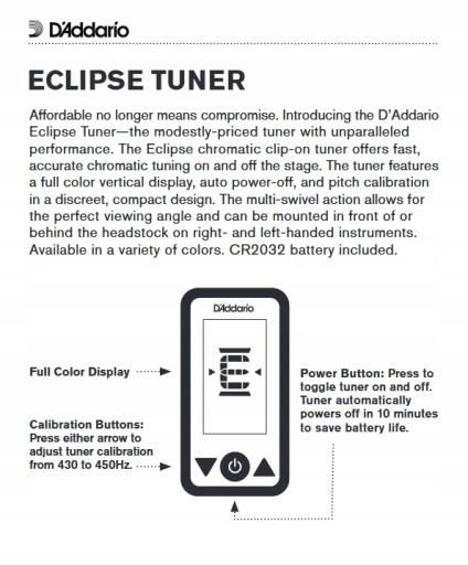 Stroik Eclipse Tuner marki D'Addario do każdego rodzaju gitary, ukulele i skrzypiec.
