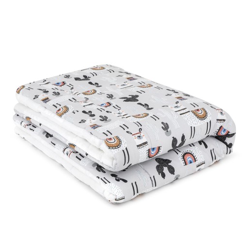 Kołderka wykonana jest z naturalnej, miękkiej 100% bawełny. Uszyta jest dwustronnie, dzięki czemu jej wygląd jest jeszcze ciekawszy i bardziej stylowy. Wewnątrz posiada mięciutkie, ciepłe silikonowe wypełnienie. Produkt jest antyalergiczny, nie wywołuje żadnych uczuleń ani podrażnień na skórze dziecka.