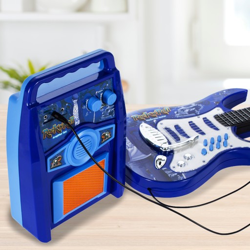 БОЛЬШАЯ ДЕТСКАЯ ЭЛЕКТРИЧЕСКАЯ ГИТАРА С УСИЛИТЕЛЕМ МИКРОФОНА, СИНАЯ ПОДСТАВКА