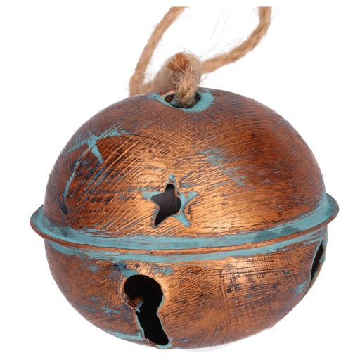 - Duży, metalowy dzwonek pokryty patyną na jutowym sznurku.