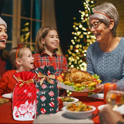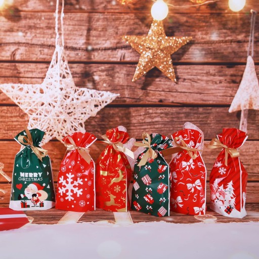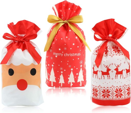 - Woreczki wykonane są z trwałego materiału o świątecznych wzorach, co sprawia, że są one doskonałym uzupełnieniem każdego prezentu.