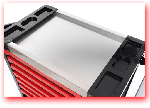 - Przedmiotem oferty jest profesjonalny wózek warsztatowy z 7 szufladami na łożyskach kulkowych i dwoma schowkami zamykanymi na kluczyk.