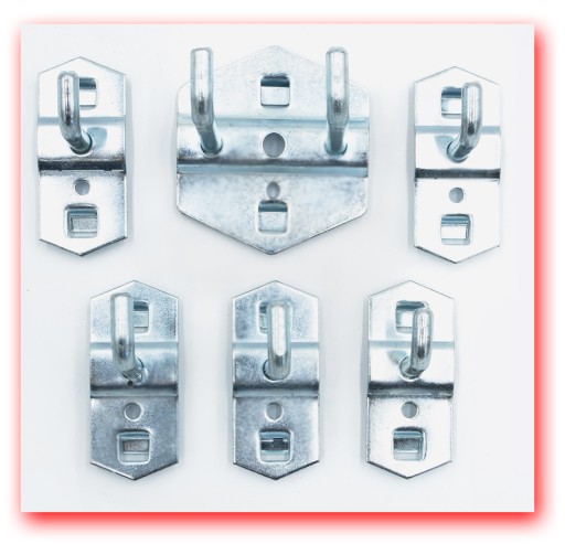 Na wyposażeniu szafki jest 6 haczyków/zawieszek, które można dowolnie wg. potrzeb umieścić na perforowanych powierzchniach szafki.