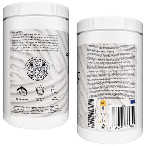 ZASTOSOWANIE – Pasta strukturalna jest idealna do projektów artystycznych, dzięki niej stworzysz struktury, które urozmaicą projekty. Jest przydatnym produktem dla zwolenników abstrakcyjnych, ale również bardziej klasycznych projektów. W celu urozmaicenia na zastygniętą pracę możesz nałożyć farbę akrylową.