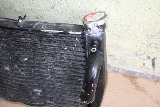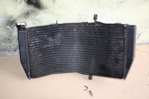 Oryginalna chłodnica wraz z wentylatorem w pełni szczelna, z uszkodzeniami jak na zdjęciach, urwane mocowanie oraz króciec, ułamane elementy w zestawie. Z Honda CBR 954 02-03r.