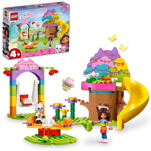 — zestaw zawiera minifigurkę Gabi oraz figurki Kiciusia Pandusia i Wróżkici, a także domek na drzewie do zbudowania z łóżkiem i przekąskami oraz ogród ze zjeżdżalnią, huśtawką i karuzelą