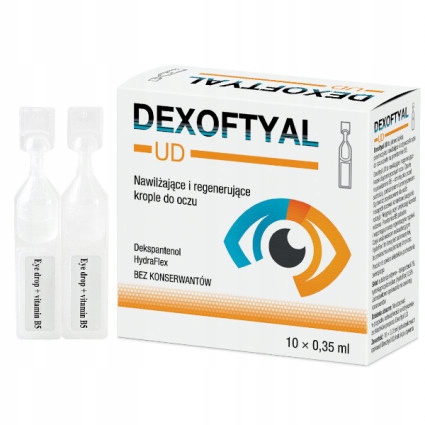 Dexoftyal UD to jałowe (bez konserwantów) krople do oczu, zawierające hialuronian sodu, który nawilża powierzchnię oka oraz prowitaminę B5 (dekspantenol), która zwiększa właściwości nawilżające hialuronianu sodu oraz zmniejsza uczucie podrażnienia, hamuje reakcje zapalne i przyspiesza gojenie nabłonka rogówki.