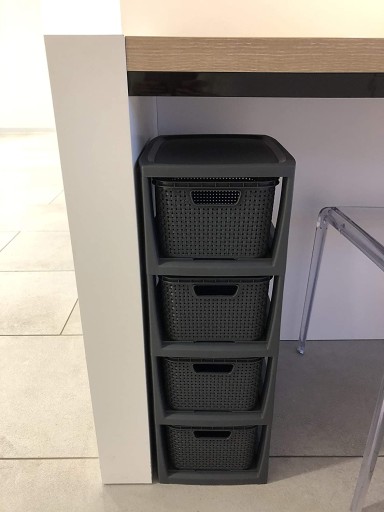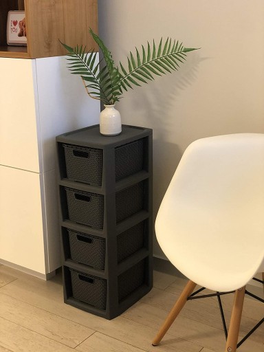 Model składa się z czterech pojemnych pojemników pełniących funkcje szuflad, wykończonych z najwyższej jakości tworzywa sztucznego, nadającego się do ponownego recyklingu i całkowicie pozbawionego szkodliwych składników. Za sprawą otworów na przednich ściankach możemy bez trudu wysunąć szufladki z regału. Stojak łatwo się czyści, a także jest odporny na wilgoć i mechaniczne uszkodzenia.