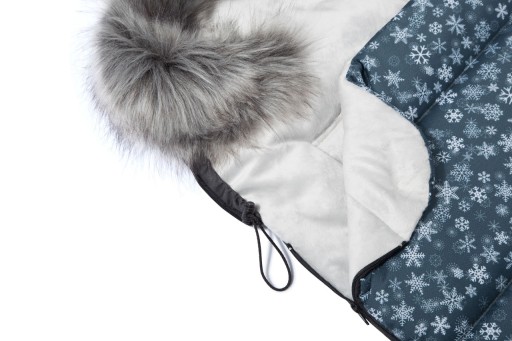 Górna część śpiworka wyposażona jest w ELEGANCKIE ODPINANE FUTERKO, które w mroźne lub wietrzne dni jeszcze lepiej zabezpiecza główkę dziecka przed niską temperaturą.