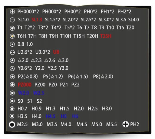 - 12 nasadek imbusowych: H0.7, H0.9, H1.3, H1.5, H2.0, H2.5, H3.0, H3.5, H4.0, H4.5, H5.0, H6.0