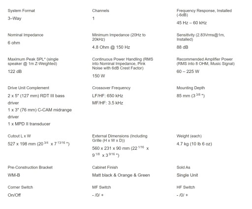 Średnica wycięcia głośnika wynosi 527 x 198 mm i wykorzystuje opatentowane złącze kabla głośnikowego Quik-Link, które rewolucjonizuje łatwość i szybkość instalacji głośników. Tri-Grip został również opracowany z myślą o prostym, niezawodnym i mocnym dopasowaniu.