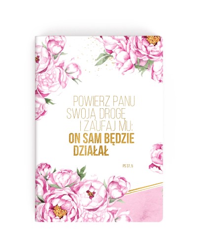 Notes z cytatami z Pisma Świętego z piękną twardą okładką z peoniami. Kwiaty narysowane specjalnie dla Urzekających przez utalentowaną ilustratorkę Zosią Oczko (@zofiaoczkoilustracje). Na okładce złotymi literami wygrawerowany napis – cytat z Psalmu 37 :