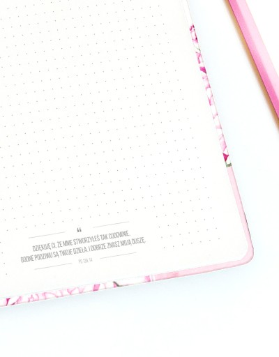 Na każdej ze stron słowa z Psalmu 139, które pomogą Ci w pamiętaniu o tym, że każdego dnia Bóg jest z Tobą – w każdej sytuacji : „Dziękuję Ci, że mnie stworzyłeś tak cudownie, godne podziwu są Twoje dzieła. I dobrze znasz moją duszę.”
