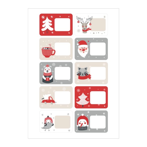 Komplet 10 dużych naklejek z motywem świątecznym z miejscem na imię dziecka oraz np. nazwą klasy/grupy. Idealne do naklejania na świąteczne upominki.
