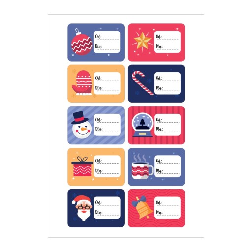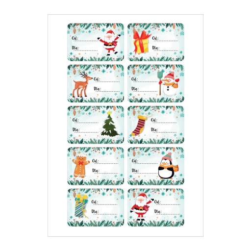 Naklejki świąteczne na Boże Narodzenie idealnie sprawdzą się do ozdoby a przede wszystkim do oznaczania prezentów. W ofercie dostępne różne wzory. Naklejki świąteczne zostały umieszczone na poręcznym arkuszu A4. Naklejki wykonane zostały na podłożu papierowym, dzięki czemu bez problemu możesz pisać po nich długopisem wpisując imię obdarowanej osoby. Na każdym arkuszu znajduje się mix wzorów. Arkusz zawiera 10 naklejek w wymiarze 7x5 cm. Naklejki można naklejać na wszelkie gładkie powierzchnie.