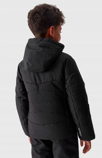 Chłopięca kurtka narciarska z kapturem i oddychającą membraną NeoDry o parametrze 5 000 przeznaczona do zimowych aktywności na stoku oraz do codziennego użytku. Wykonana z gładkiej tkaniny z ociepliną poliestrową.