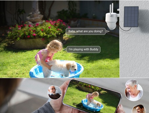 - 1080P HD i 20-metrowa nocna wizja: zewnętrzna kamera monitorująca WiFi PT z zewnętrznym panelem słonecznym jest wyposażona w czujnik kolorów CMOS 1/3, który przechwytuje filmy i obrazy w wysokiej rozdzielczości 1080p, nawet w nocy może wykryć wyraźny obraz dzięki wbudowanemu świetle podczerwieni]