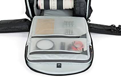 Plecak Lowepro posiada adaptacyjne wnętrze podzielone przedziałami, które można dowolnie ustawiać i dopasować do sprzętu, który zabieramy ze sobą. W środku zmieści się sprzęt w różnych konfiguracjach, mogą to być: dwa systemy dslr, kilka obiektywów, lampy i mniejsze akcesoria lub lustrzanka z teleobiektywem, dwa mniejsze obiektywy, dron, gimbal, kamerka sportowa i akcesoria. Możliwości konfiguracyjne są bardzo szerokie i zapewniają wykorzystanie całej pojemności plecaka.