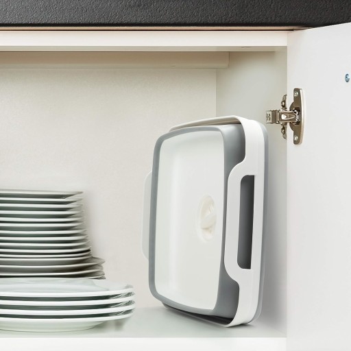 SKŁADANY KOSZ NA ŚMIECI: Składany kosz na śmieci jest biało-szary i ma wymiary 30,5 cm x 31 cm x 19,5 cm po rozłożeniu. Posiada 2 uchwyty i otwór odpływowy o średnicy 7 cm. Dno, obręcz i uchwyty wykonane są z wytrzymałego plastiku, a składane części boczne z silikonu. Mieści do 16 litrów zimnej lub gorącej wody.