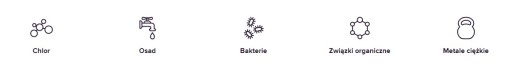 Usuwa z wody wodociągowej wszelkie zanieczyszczenia w tym chlor, związki organiczne, metale ciężkie, fenol, twardość, bakterie.