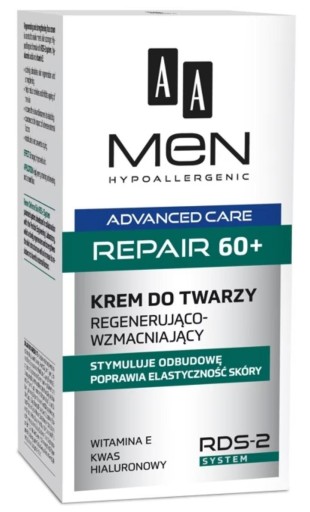 MEN ADVANCED CARE - REPAIR 60+ marki AA. Krem do twarzy. Jest hipoalergiczny. Stworzony został specjalnie do codziennej pielęgnacji męskiej, dojrzałej skóry, osób w wieku 60+. Swoje działanie opiera na bazie kwasu hialuronowego oraz witaminy E. Aktywnie stymuluje komórki skóry do regeneracji i szybszej odnowy. Skutecznie redukuje istniejące zmarszczki oraz zapobiega powstawaniu nowych. Długotrwale nawilża, odżywia oraz wygładza. Regularnie stosowany wzmacnia naskórek oraz przywraca mu odpowiedni poziom jędrności i elastyczności. Dostępny jest w opakowaniu o pojemności 50 ml.