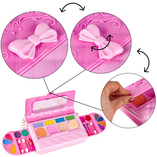 Uroczy zestaw do malowania makijażu składany w torebkę z łańcuszkiem, zawiera dużą ilość różnych kosmetyków, które z pewnością ucieszą każdą małą dziewczynkę. Znajdziemy kolorowe cienie do powiek, błyszczyki czy nawet róże do policzków.