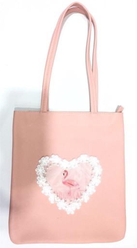 Duża, różowa torba z kolekcji Bourgeois. Ozdobiona koralikami oraz koronkowymi kwiatami ułożonymi w kształt serca. Torbę można nosić na ramieniu. Posiada wewnętrzną kieszeń. Torebka jest zapinana na zamek. Uwielbiana przez dziewczynki, idealna na zakupy.