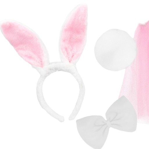 Śliczne i milutkie w dotyku akcesoria umożliwiające przemianę w królika :) Milutka opaska, muszka oraz ogonek z gumką do zamocowania na pasku / w pasie.