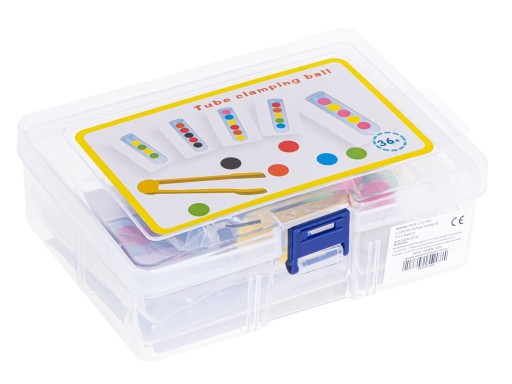 Czas połączyć zabawę z nauką! Czy jako rodzic możesz wyobrazić sobie coś lepszego? Duży zestaw edukacyjny pozwoli na wiele godzin ciekawej i przyjemnej zabawy! Produkt zgodny jest z zasadami pedagogiki opracowanej przez Marię Montessori - zabawa nim jest niesamowicie prosta i zapewnia wiele wartości edukacyjnych! Głównym celem zabawy jest sortowanie kuleczek do odpowiednich próbówek! Maluch może to robić używając dłoni lub dołączonych do zestawu szczypiec! Oczywiście taka zabawa to tylko sugestia! Jedynym ograniczeniem będzie wyobraźnia - bez wątpienie do głowy przyjdzie wam mnóstwo ciekawych pomysłów! W zestawie znajduje się aż kolorowych 40 kulek, które można nie tylko sortować, ale również wesprą dziecko w nauce liczenia i nauki kolorów! Dodatkowo kuleczki są duże, ich średnica wynosi 5.5 cm, łatwo więc je złapać i trudno połknąć!24 dwustronne karty zapewnią inspirację.Przedstawiają wzory, jakie należy ułożyć w próbówce. Zadanie może wydawać się proste, ale z początku na pewno będzie stanowić nie lada wyzwanie! Obsługa pęsety pozwoli poprawić zdolności manualne dziecka! Poprawi jego koordynację wzrokowo - ruchową, a także precyzję i dokładność ruchów rąk i dłoni! Zabawa pozytywnie wpłynie również na szereg zdolności intelektualnych.Dziecko poprawi swoje umiejętności skupienia, liczenia i odróżniania oraz nazywania kolorów! Wykorzystane materiały są bardzo trwałe, dzięki czemu zabawka wystarczy na wiele godzin nauki i rozrywki!