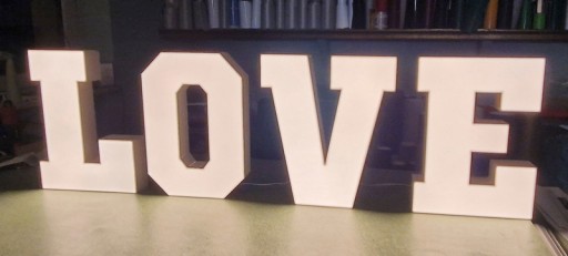 - Litery świecące, LOVE, wykonane z PLEXI (lico), boki i tył z PCV 5mm gr.