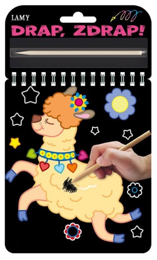 - Książeczka ZDRAPYWANKA z RYSIKIEM, dzięki któremu powstaną kolorowe obrazki z lamami.
