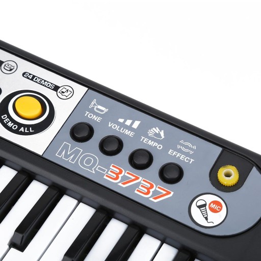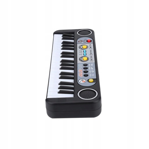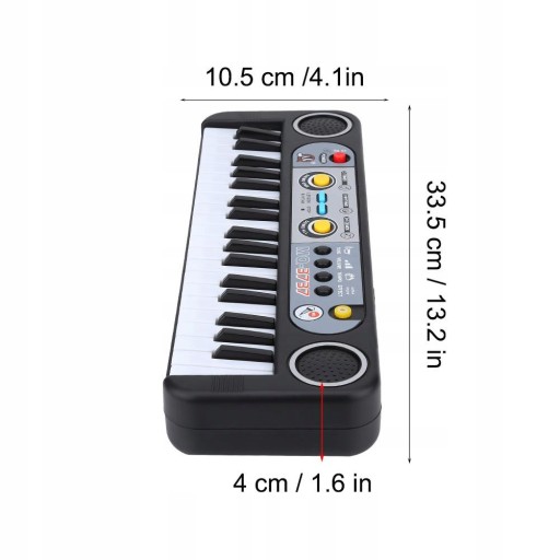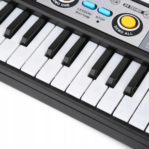 Funkcje: Cudowne zabawki inteligencji muzycznej do rozwijania świadomości mózgu u dzieci.Z doskonałą funkcją 3 rodzajów tonów, 8 rodzajów rytmów, 24 demonstracji również z regulacją rytmu i głośności.Zasilanie bateryjne, które nie jest dołączone, wygodne do gry w pomieszczeniu lub na zewnątrz.Dzięki mini mikrofonowi dzieci mogą śpiewać podczas zabawy. Może przynieść wiele radości swoim dzieciom. Jasny i wygodny klawisz do łatwej gry.Delikatne 37 czarno-białych klawiszy.