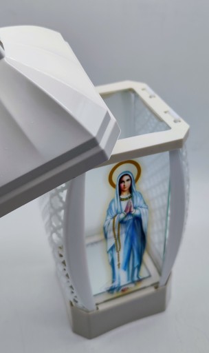 Znicz wykonany z elementów szkła i najwyższej jakości tworzywa. Znicz posiada NADRUKOWANY WIZERUNEK MARYJKI na szybie przedniej.