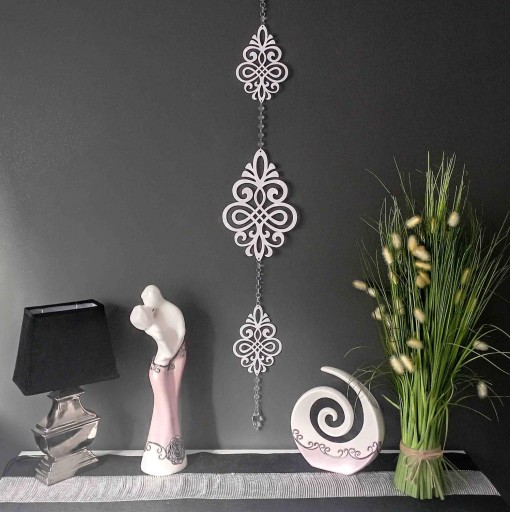 Ażurowa zawieszka połączona akrylowym łańcuszkiem zakończonym efektownym wisiorkiem