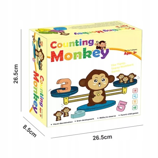 Spójrz, jakie wspaniałości kryje ta zabawka: kolorowa waga szalkowa z figurką małpki, odważniki w kształcie małych małpek, cyfry i karty z zadaniami zapewnią Ci długie godziny ciekawej zabawy, która doprowadzi Cię do fascynujących odkryć!