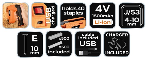 Zszywacz ładuje się do pełna w około 5 godzin. W zestawie oferowany jest z ładowarką, kablem USB oraz 500 sztukami zszywek i 500 sztukami gwoździ.