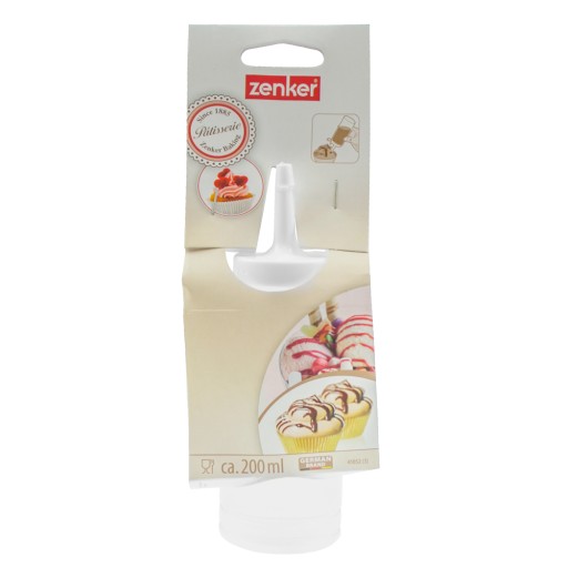 Dekorator niemieckiej firmy Fackelmann pozwoli w prosty sposób pięknie udekorować ciasta, ciasteczka, torty, lody, naleśniki, gofry czy desery. Bardzo prosty w użyciu co sprawia, że nie trzeba mieć dużego doświadczenia w dekoracji cukierniczej. Wystarczy do środka wlać lukier, czekoladę, krem lub gęsty sos i delikatnie naciskać obudowę aby stworzyć niepowtarzalną dekorację. Po skończonym dekorowaniu butelkę można zamknąć, nakładając na końcówkę do dekorowania dołączony do mały kapturek i bezpiecznie przechować w lodówce
