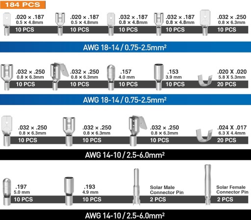 16 rodzajów złączy do zacisków drutowych. W tym różnorodne specyfikacje męskich i żeńskich zacisków widełkowych oraz zaciskane złącza zaciskane piggyback, różnorodne style spełnią Twoje różne potrzeby.