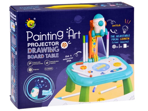 Po wciśnięciu przycisku jeszcze raz włączy się projektor dzięki któremu będziemy mogli wyświetlić obrazki takie jak kosmiczny świat, zwierzęta, pojazdy oraz podwodny świat. Rzutnik posiada blat na którym dziecko będzie mogło poukładać pisaki, i rysować, odrysowywać wyświetlane obrazki z rzutnika. Tablica została bardzo ładnie wykonana sprawi wiele frajdy podczas zabawy. Świetna zabawa zapewniona.