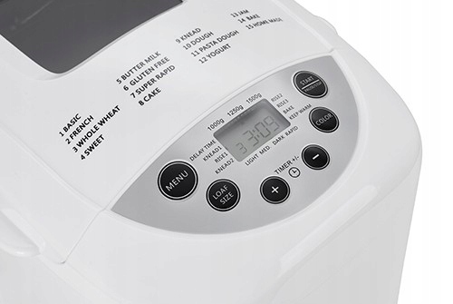 Maszyna do wypieku chleba wyposażona jest w dwa mieszadła, co zapewnia dokładne połączenie składników. Liczne udogodnienia sprawiają, że korzystanie z tego urządzenia to sama przyjemność! Istnieje możliwość wyboru wielkości bochenka (od 750 do 1250g) oraz wyboru koloru skórki, czyli stopnia przypieczenia chleba. Wewnątrz znajduje się wyjmowana forma pokryta warstwą ułatwiającą wyjmowanie upieczonego już bochenka. Dodatkowe funkcje jak podtrzymywanie temperatury czy opóźniony start pozwalają kontrolować przebieg pieczenia. W pokrywie znajduje się okienko, przez które można obserwować proces wypieku. Co więcej urządzenie ma wyświetlacz LCD oraz przyciski w łatwo dostępnym miejscu, dzięki czemu korzystanie z tego urządzenia jest naprawdę intuicyjne!