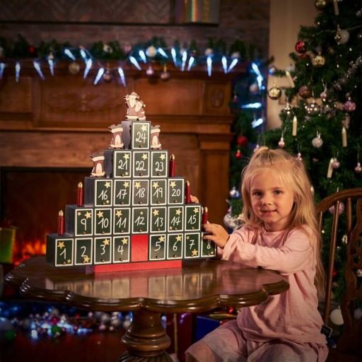 Bożonarodzeniowe figurki zdobiące drewniane drzewko z mikołajami i drewnianymi świeczkami sprawiają, że kalendarz będzie przyciągał wzrok w każdym domu.