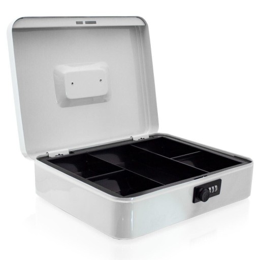 Fabrycznie nowa, wysokiej jakości metalowa kasetka do przechowywania lub transportu monet, banknotów lub innych wartościowych przedmiotów. Solidna i poręczna walizka z metalu wyposażona w sortownik do monet jest idealnym miejscem do przechowywania banknotów oraz monet. Na dole jest sporo miejsca na przykład na rachunki, paragony, monety, banknoty i inne przydatne przedmioty. Dla bezpieczeństwa kasetka jest zamykana na zamek szyfrowy.