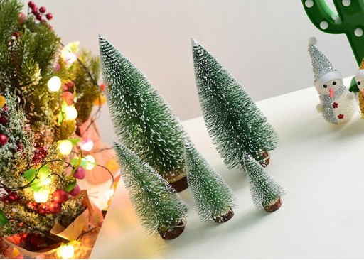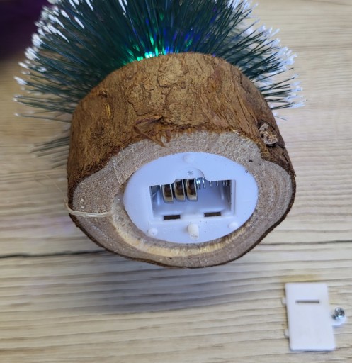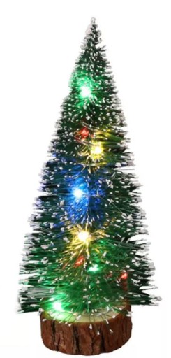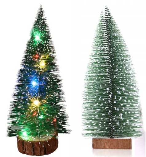 - kolory - zielona choinka z biały oprószeniem i drewnianą podstawą