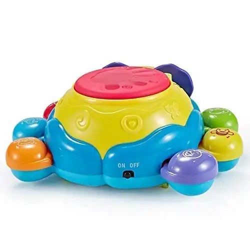 Zabawka ma wbudowany czujnik, dzięki któremu po napotkaniu przeszkody obraca się w inną stronę. Górny bębenek do naciskania rączką odtwarza dźwięki i melodie. Przycisk ze znakiem zapytania uruchamia quiz, w którym zabawka zadaje pytanie o kolor lub nazwę zwierzątka - w odpowiedzi należy nacisnąć odpowiedni przycisk.